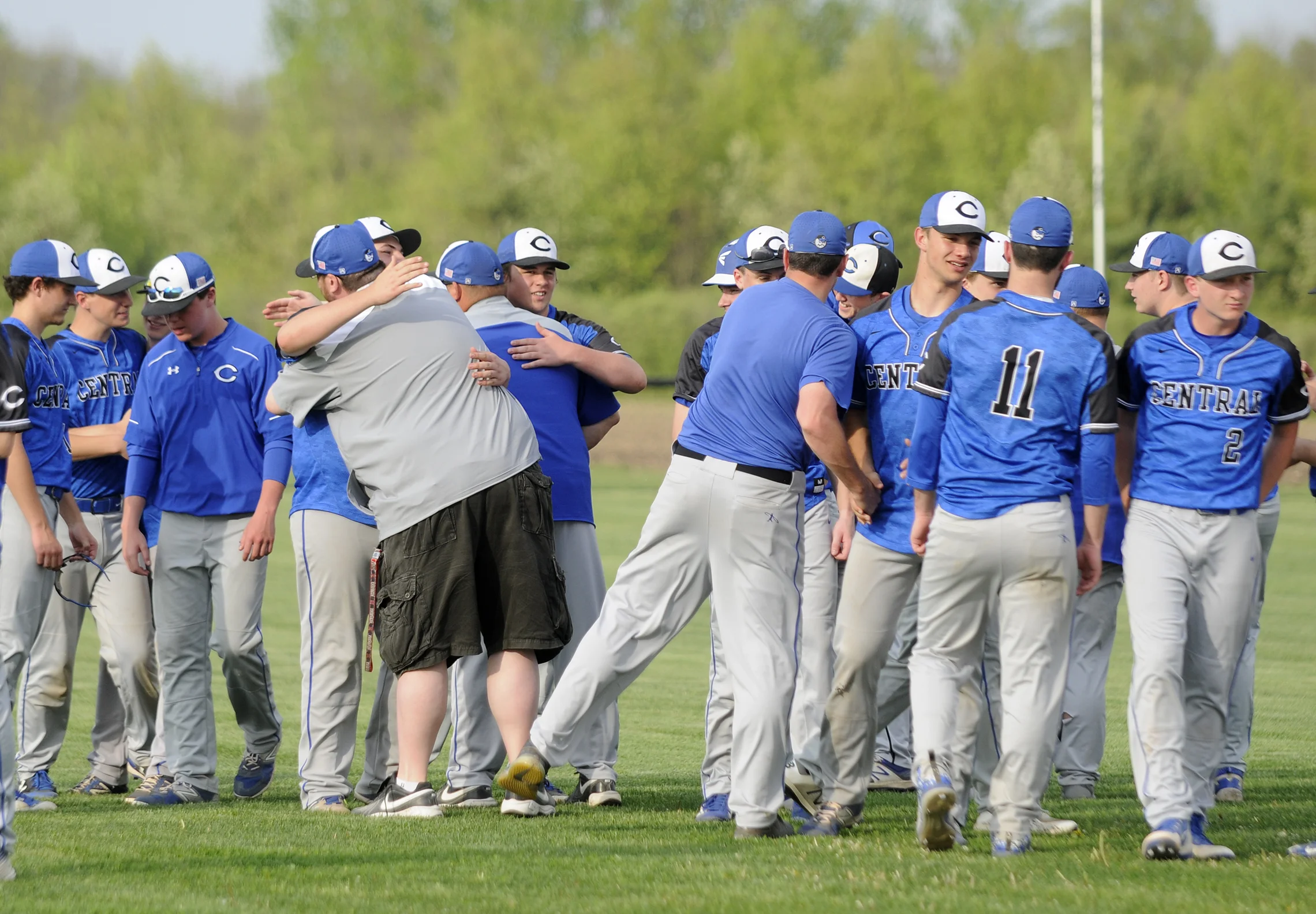 Teammates congratulate Bishop McNamara’s Tyler Hiller after a home run hit Monday during the game against Clifton Central. Bishop McNamara’s Fightin’ Irish won the game 14-0 to end the season for the Clifton Central Comets.